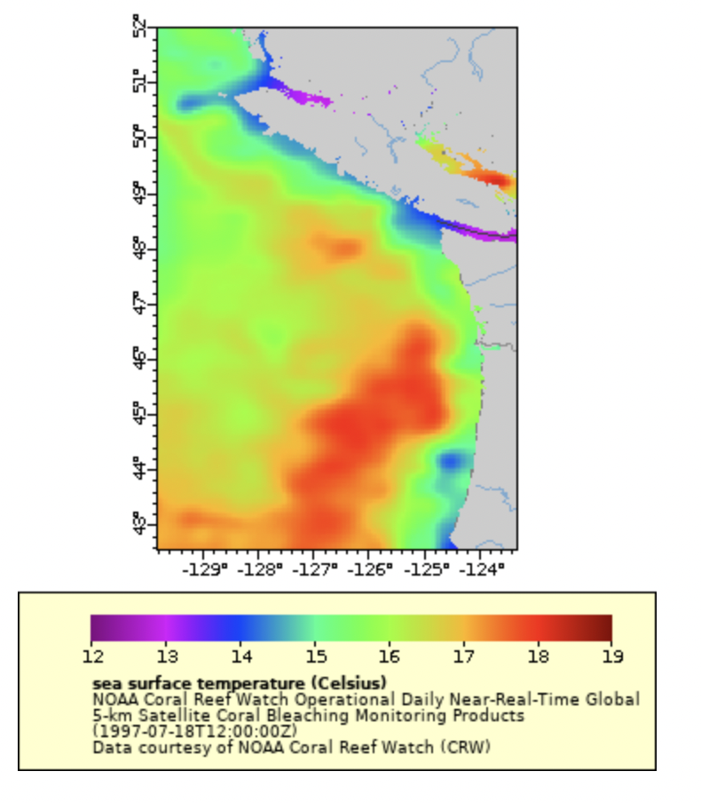 Figure 2: NOAA satellite image showing sea surface temperature (SST) in Celsius off the coast of Vancouver Island and Washington. Red is high temperature (~18°C), green is medium temperature (~15°C) and blue/purple is low temperature (~13°C)
