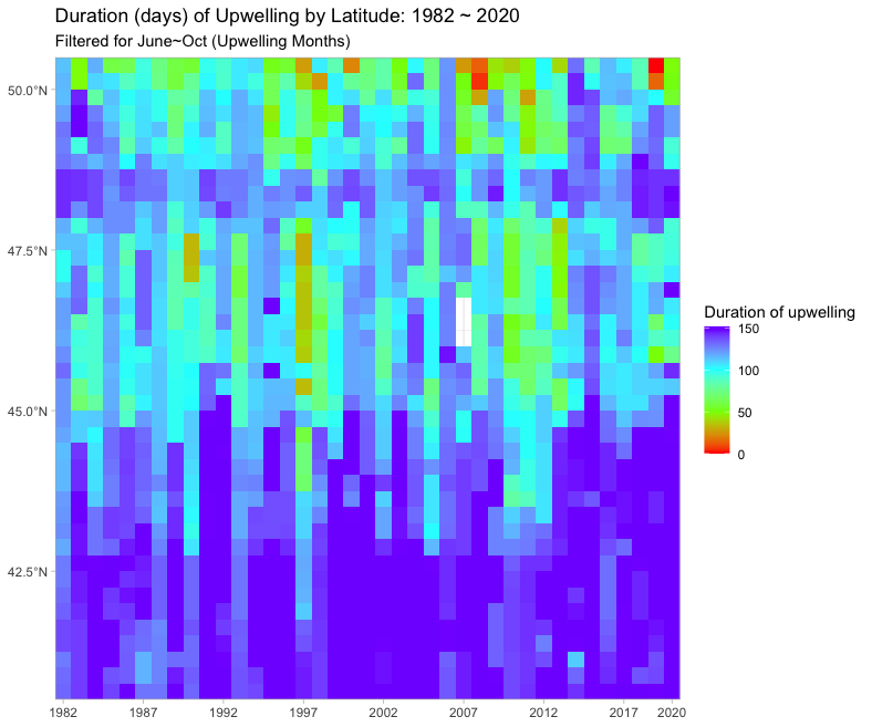 Overall, southern latitudes (40.0°N ~ 45.0°N) show longer duration of upwelling. This is natural since the previous plot showed that in the southern latitudes, upwelling started earlier than the northern latitudes. There are some northern latitudes with short duration of upwelling. Around 50.0°N and 47.5°N, the duration of upwelling is shorter than its surrounding latitudes. In 1997, a shorter duration of upwelling was observed at 45.0°N ~ 47.5°N than surrounding years.