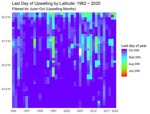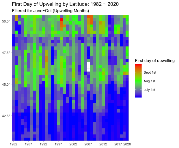 The plot above shows that the first day suggesting a coastal upwelling process by our automatic detection method was from June to October. Overall, upwelling started later for the northern latitudes (45.0°N ~ 50.0°N) than the southern latitudes (40.0°N ~ 45.0°N). There is a band of latitudes around the late 1990s and late 2000s when the first day of upwelling was late September. Also, around 48.0°N, the first day of upwelling is much earlier (June) than the surrounding latitudes, where the first day of upwelling was in August.