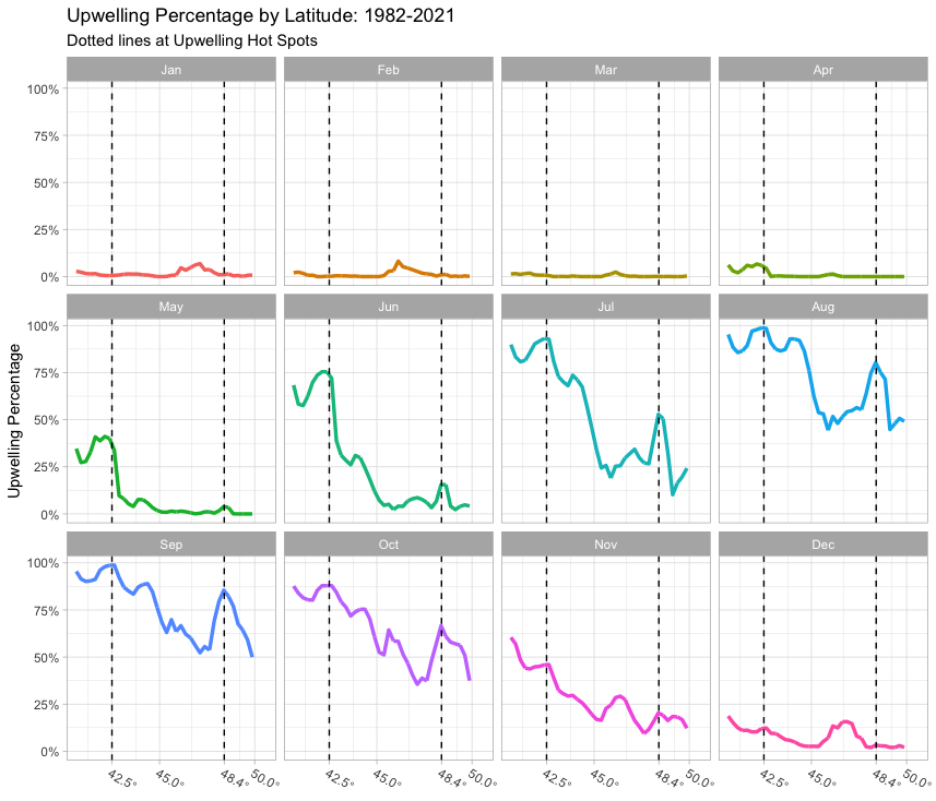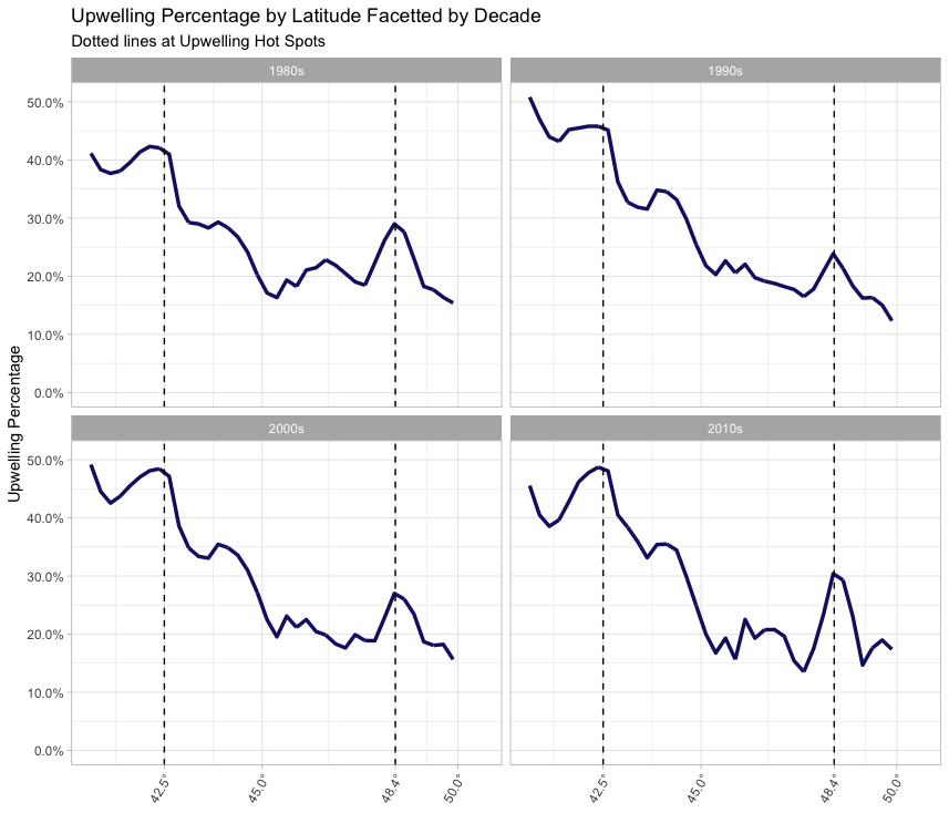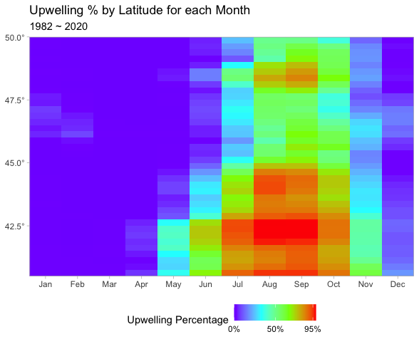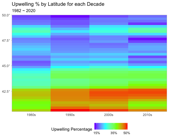 This plot confirms the above findings of a consistent upwelling pattern from June to October and higher upwelling percentages in the lower latitudes (40°N ~ 45°N). Interestingly, there is a glimmer of high upwelling percentage around 48.0°N from August to September. This latitude is same as the latitude where in the 1980s and 2010s, upwelling percentage was observed to be around 35%.