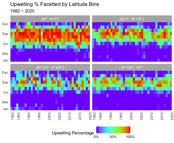 Figure 8: Heatmap of upwelling percentage facetted by latitude bins from 1982 to 2020. Red means high upwelling percentage (~95%) , blue means low upwelling percentage (~0%), and green is the average upwelling percentage (~50%). This plot segments the previous plot into four latitude bins: [40°N, 43.5°N], [43.5°N, 46.126°N], [46.125°N, 47.625°N], and [47.625°N, 50°N].