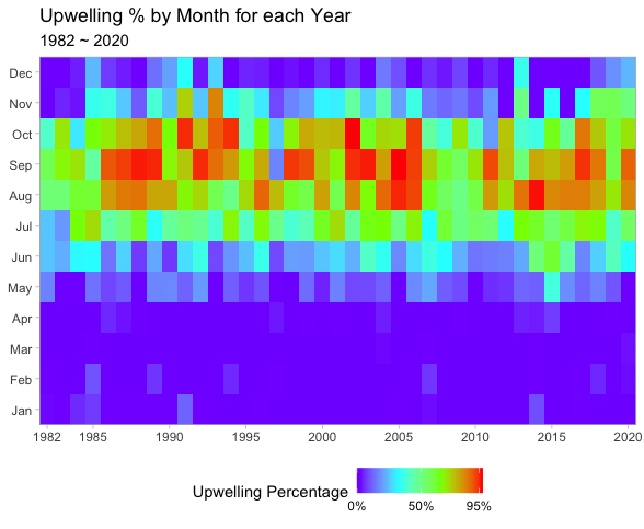 Figure 7: Heatmap of the proportion of upwelling days in each month from 1982 to 2020. Red means high upwelling percentage (~95%) , blue means low upwelling percentage (~0%), and green is the average upwelling percentage (~50%).