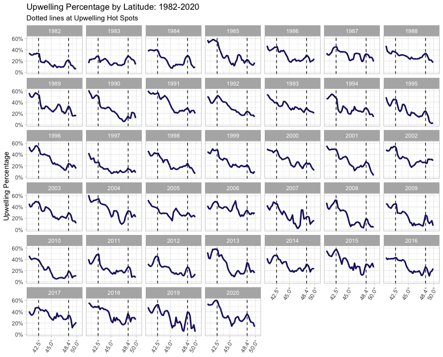 Figure 13: Lineplots of upwelling percentage from 1982 to 2020.