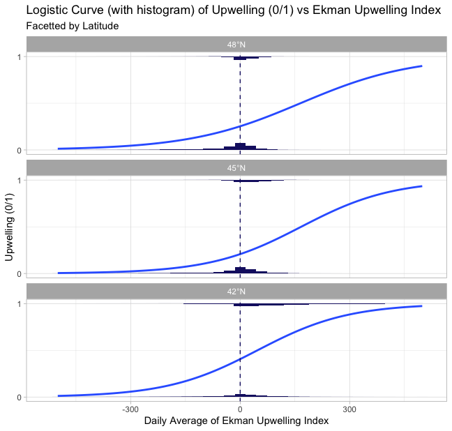 Above is a logistic curve drawn on a plot of the upwelling indicator variable and daily average of Ekman upwelling index. As we go from 42°N to 45°N and from 45°N to 48°N, there seem to be less and less positive upwelling indexes at y = 1