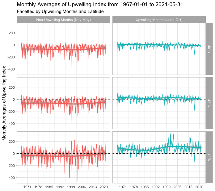 Figure 4 : Line plot of monthly averages of Ekman upwelling index on the y-axis and year on the x-axis facetted by latitude (42°N, 45°N and 48°N) and upwelling months (June ~ Oct / Nov ~ May).
