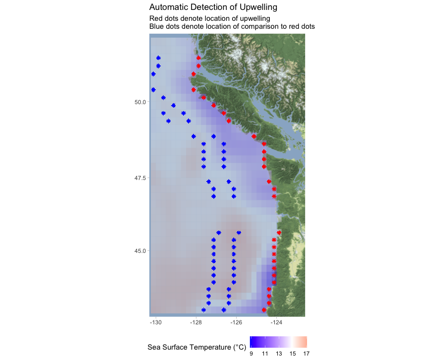 Upwelling is the upward movement of deep, cold water caused by wind blowing parallel to the coastline. We designed a custom automatic detection method using SST differential to accurately identify when and where upwelling occurs. We discovered that monthly averages of Ekman upwelling index has a statistically significant relationship with the upwelling indicator, which were determined by our automatic detection method.