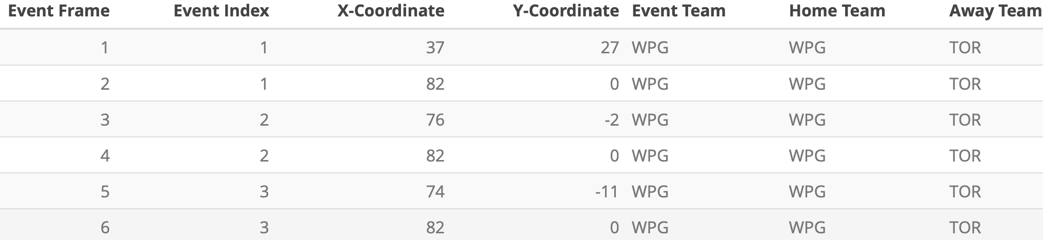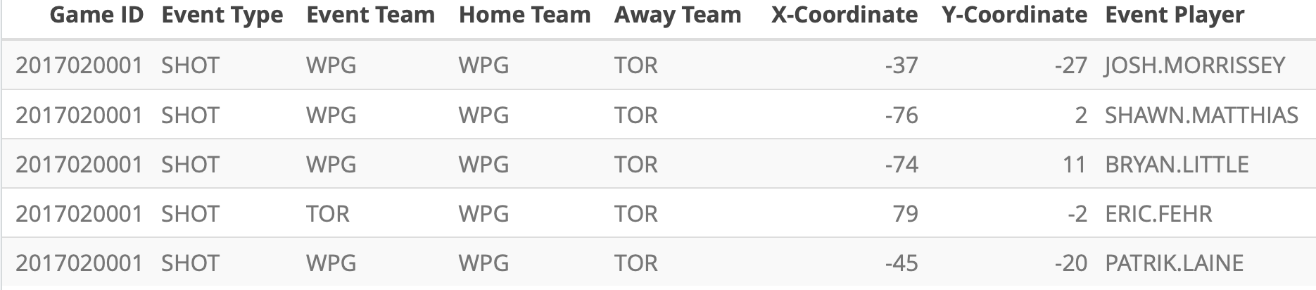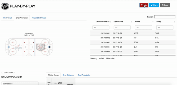 The animation happens on a NHL ice rink created by War On Ice. I added “reactive” team logos on Shiny to clearly indicate which side is the home/away side. Also, in the app, users need to input the official game ID in order to navigate between games. In order to facilitate this process, I included a datatable of all the game IDs, game dates, home teams, and away teams next to the animation. That way, the user can find the desired game by searching through game dates or teams, locate the right Game ID, and render the right animation.