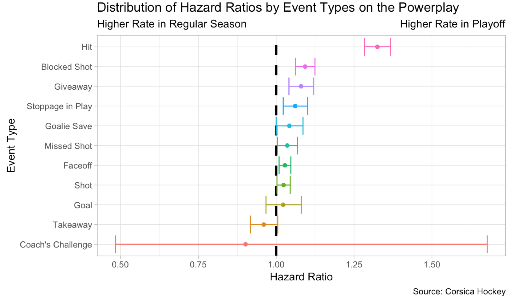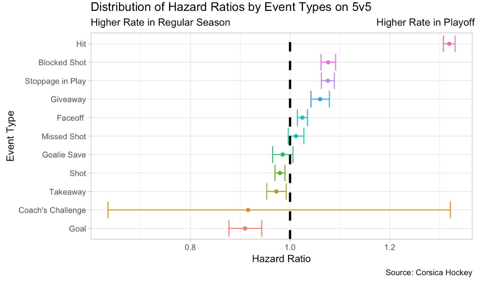 Lastly, let’s observe coach’s challenges, a recent addition to the NHL rulebook. The hazard ratio is 0.916. In other words, coach’s challenge decreases by 8.5% in 5-on-5 situations from the regular season to playoffs. During postseason hockey, the coaches are more conservative since they don’t want to lose the opportunity to call a timeout and draw up a play in the last minutes of the game. Notably, the confidence interval for the hazard ratio of coach’s challenges is extremely wide, demonstrating that this change is not statistically significant. Thus, I would caution the reader from making a conclusion whenever we have this wide of a confidence interval for any events.