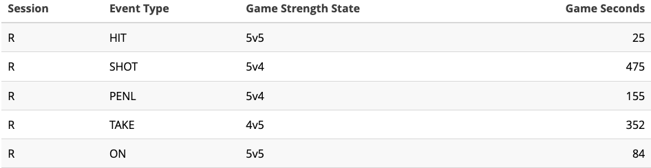 I will be using Play by Play (PBP) data from 2007-2008 to 2017-2018 NHL seasons provided by Emmanuel Perry, creator of Corsica Hockey. The dataset contains 56 variables and over 13 million rows. Noteworthy variables I’ll be using for my analysis include Session (P for Playoffs and R for Regular Season), Event Type(Goals, Hits, Blocked Shots, Penalties, etc), Game Strength State (5v5, 4v5, 5v4, etc), and Game Seconds (Time of event during game in seconds).