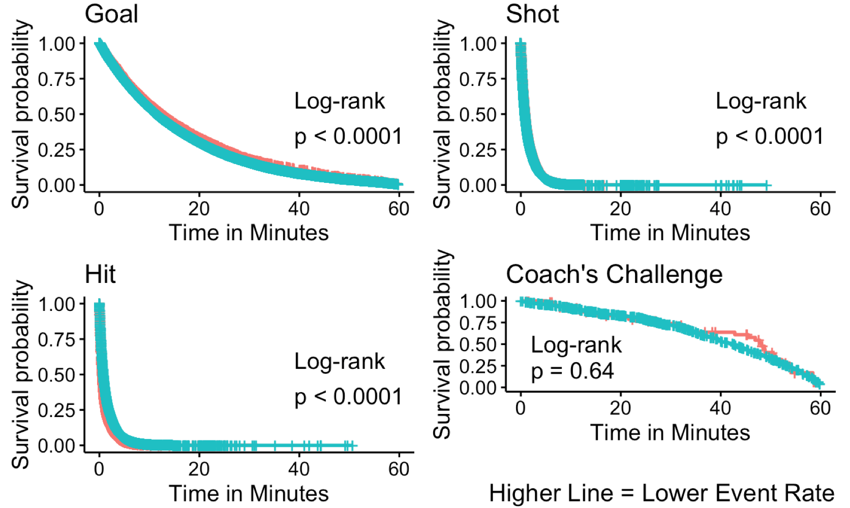 - The coach’s challenge survival curve during the playoffs looks significantly different.