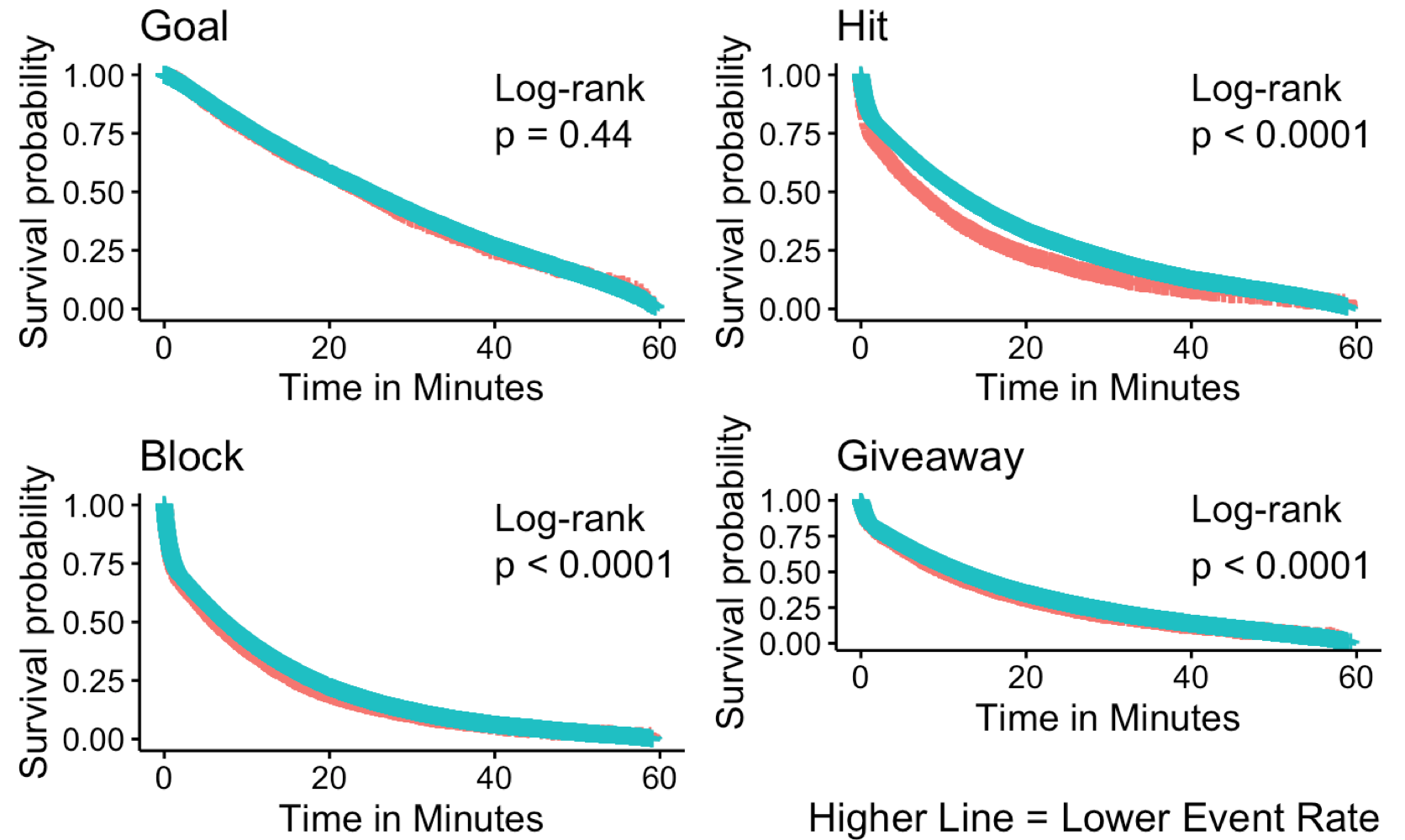 - The steepness of survival curves show that goals rarely, if ever, precede hits or shots