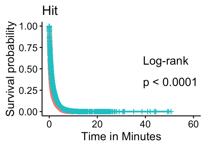- Hits survival curves are the most different out of all the survival curves and demonstrate that the game level intensity jumps alot.