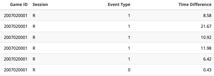 I wrangled the data into a format for survival analysis. Again, Session describes whether game was held during regular season(R) or playoffs(P). Event Type specifies whether event of interest (in this case, goals) happened (1). A value of 0 for Event Type refers to the end of the game. Time Difference is the survival time in minutes, or in this case the time intervals between goals.
